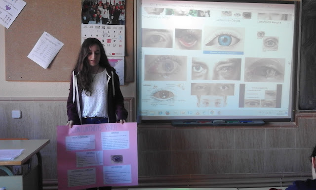 BLEFARITIS (Bacteria). "Es una enfermedad que afecta a los párpados causada en gran parte por estar mucho tiempo delante de una pantalla, usar maquillaje o estar en ambientes irritantes. Algunos de sus síntomas son ojos rojos, picor, sensación arenosa en los ojos o la aparición de costras en la zona. No es muy contagiosa y tan solo se pueden aliviar los síntomas con un tratameinto". Adrián.